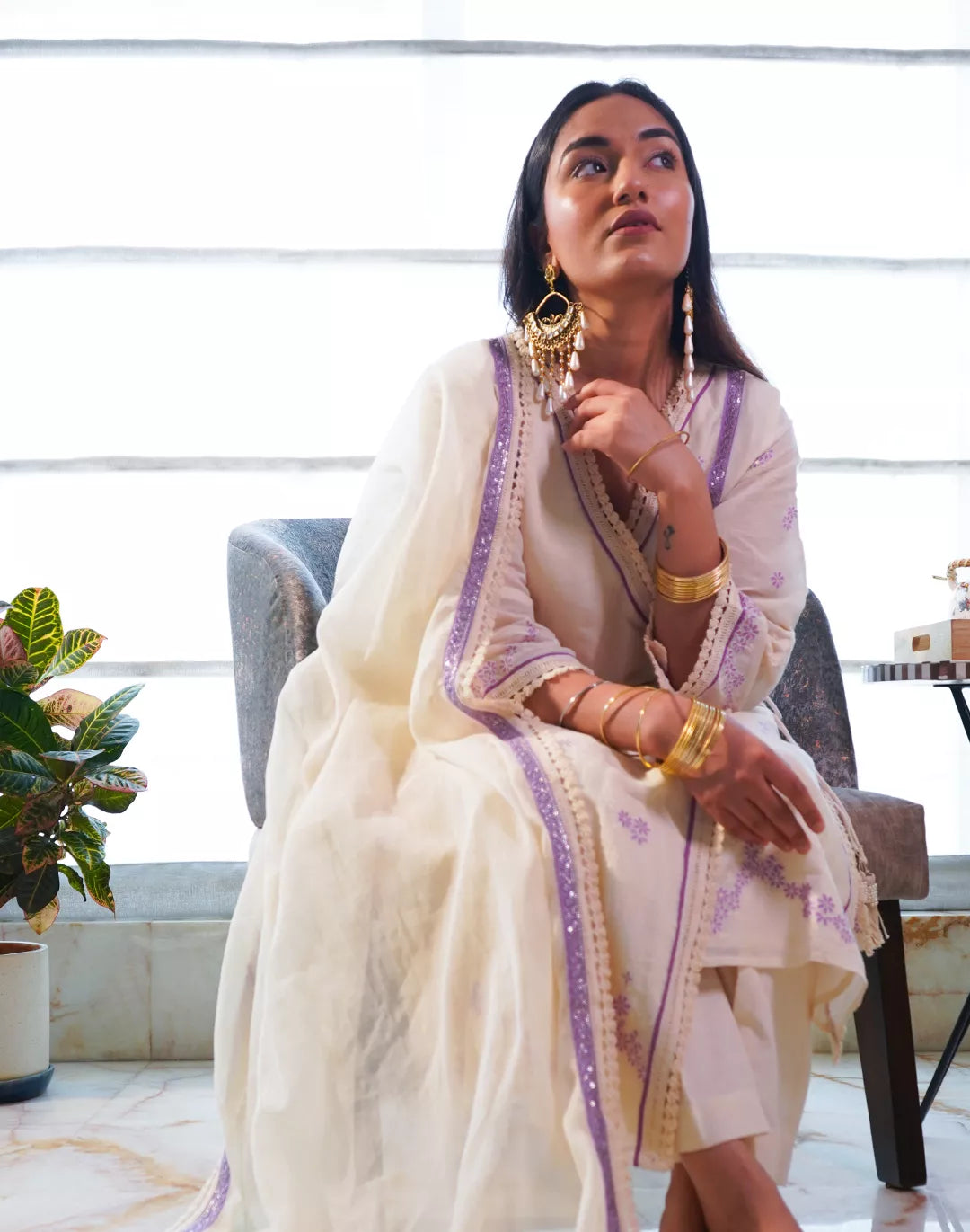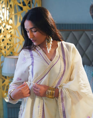 An elegant interplay of tradition and edge, this Angarakha-style kurta brings old-world craftsmanship to modern-day wardrobes. The purple threadwork pops against the soft beige cotton, while the dupatta’s lace finishing adds just the right amount of drama. It’s timeless with a touch of rebellion.
