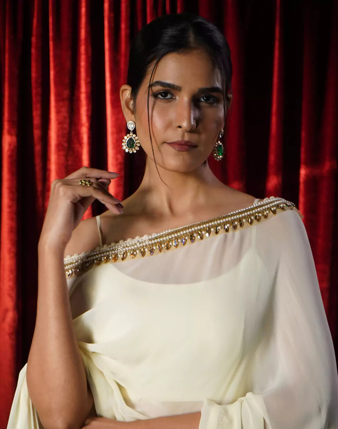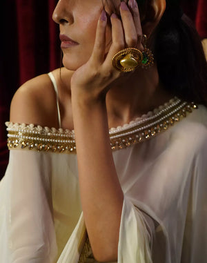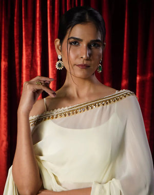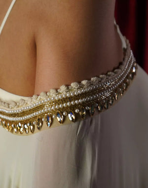 A graceful cream kaftan adorned with intricate neckline detailing, finished with delicate tassel lace along the edges. Paired with a chic bustier inside and elegant gold striped pants, this ensemble perfectly blends comfort with understated glamour.